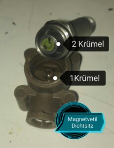 Im Ventilsitz hatten sich Krümel zwischen die Gummi-Dichtfläche und die konische Durchflussöffnung gelegt. Dadurch war das Ventil ständig geöffnet und die Pumpe brachte das Wasser direkt zum Auslauf statt es durch die Brüheinheit zu drücken.